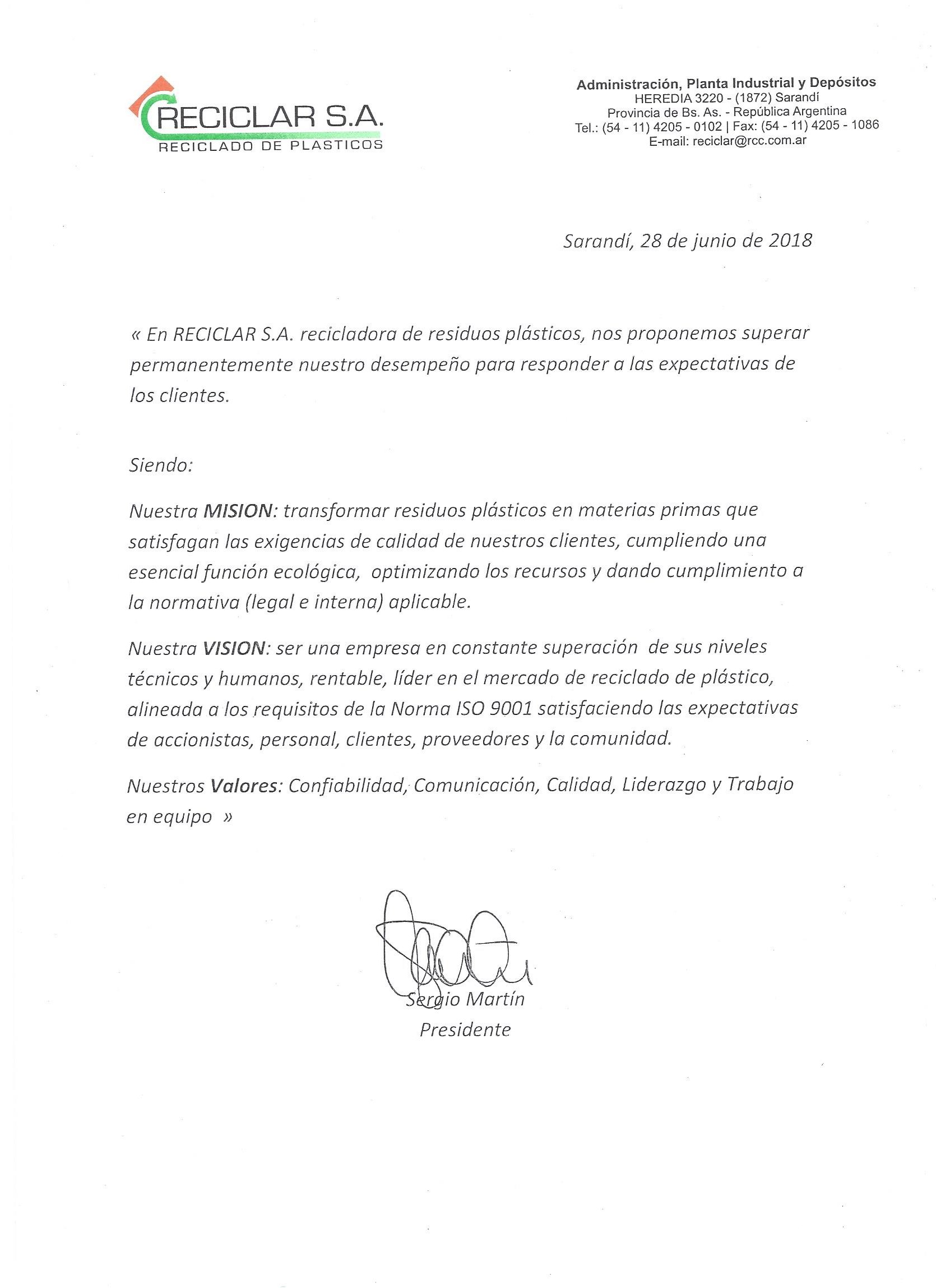 – Ser una empresa en constante superación de sus niveles técnicos y humanos, rentable, líder en el mercado de reciclado de plástico, alineada a los requisitos de la Norma 1SO 9001 satisfaciendo las expectativas de accionistas, personal, clientes, proveedores y la comunidad.